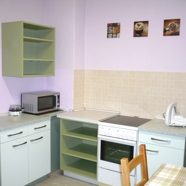 Kühlschrank, Herd, Minibackofen, viele Küchengeräte |
